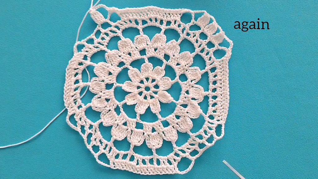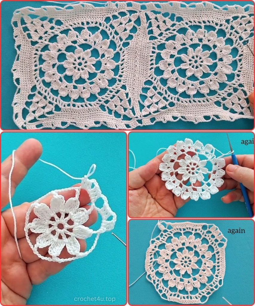 This motif is worked in 5 rounds, starting with the floral center and ending with a squared border.