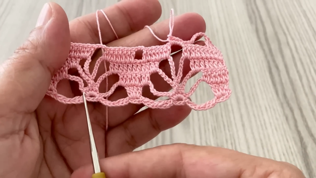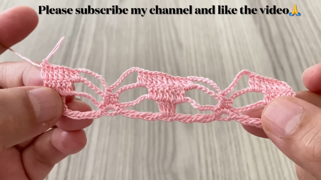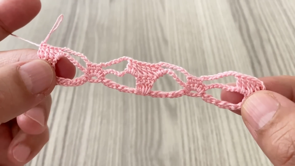 - Final Row: To finish your piece, end after a Row 5 repeat (the trellis row). You can fasten off here for a light, scalloped edge, or work one final row of Sc across the top edge for a slightly neater finish.