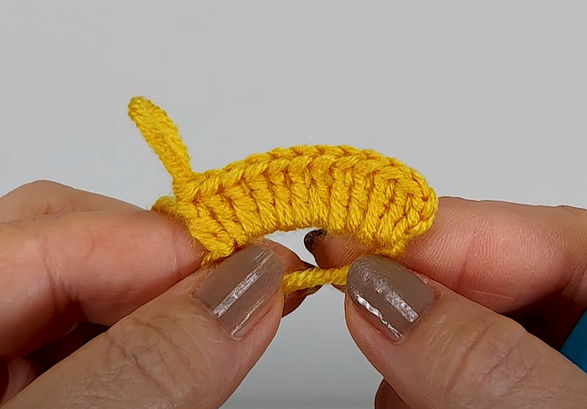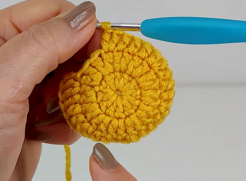 We start with the toe using Color A (Yellow), working in a continuous spiral.