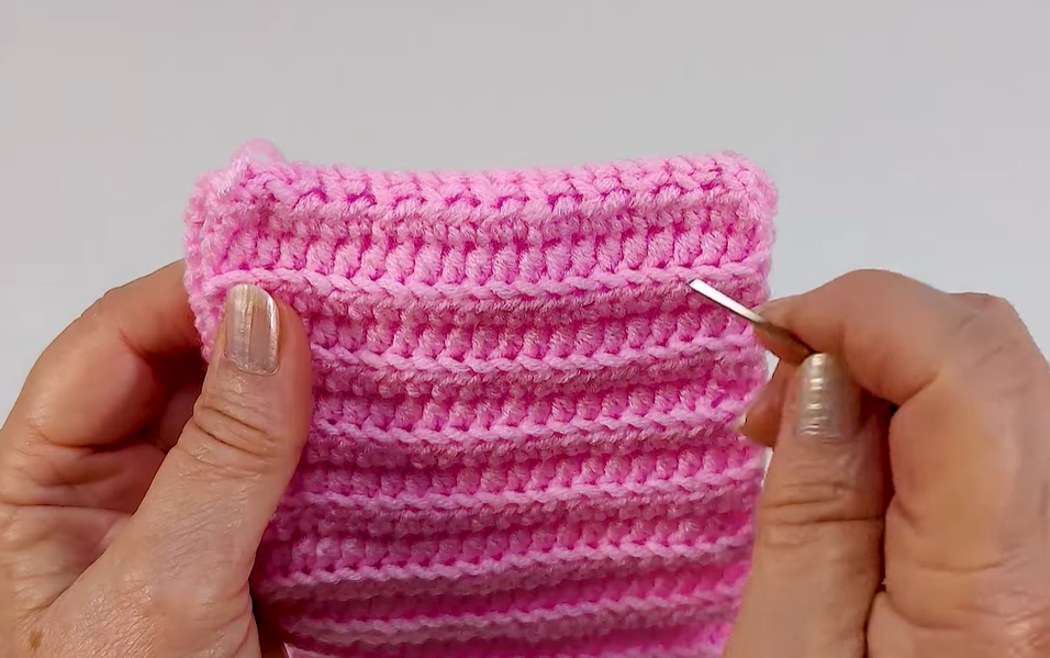 The entire body is worked in simple rows using the BLO technique to create the horizontal lines that look like knitting.