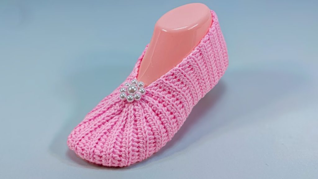 Hello, lovely crocheters! Get ready to create the most elegant and comfortable house shoe you’ve ever owned. The pink slipper you see above is a perfect example of a cozy crocheted ballet flat. Its standout features are the beautiful vertical ribbing across the entire piece and the delicate gathered toe that gives it that classic shoe shape.