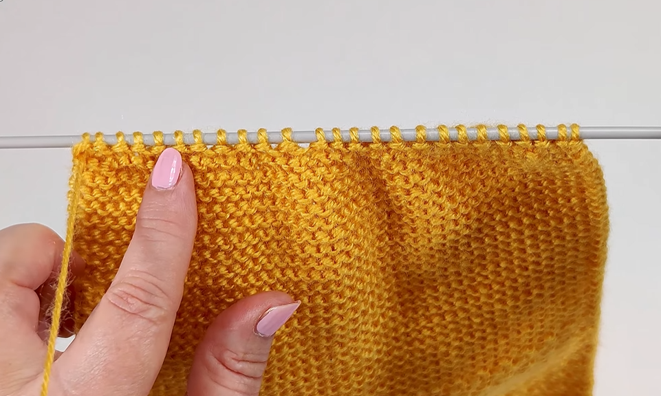 - Carefully run the needle through the edge loops of the 19 (17) held stitches.