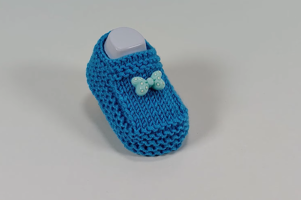To ensure the bootie never slips off, you can knit a functional button strap: