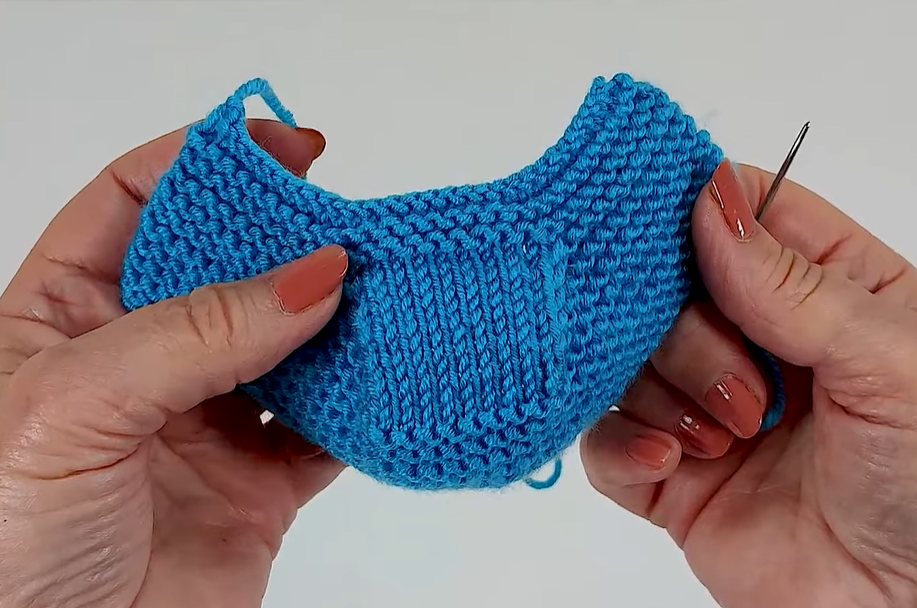 The final shape of the bootie is defined by the strategic folding and seaming of the knit piece.