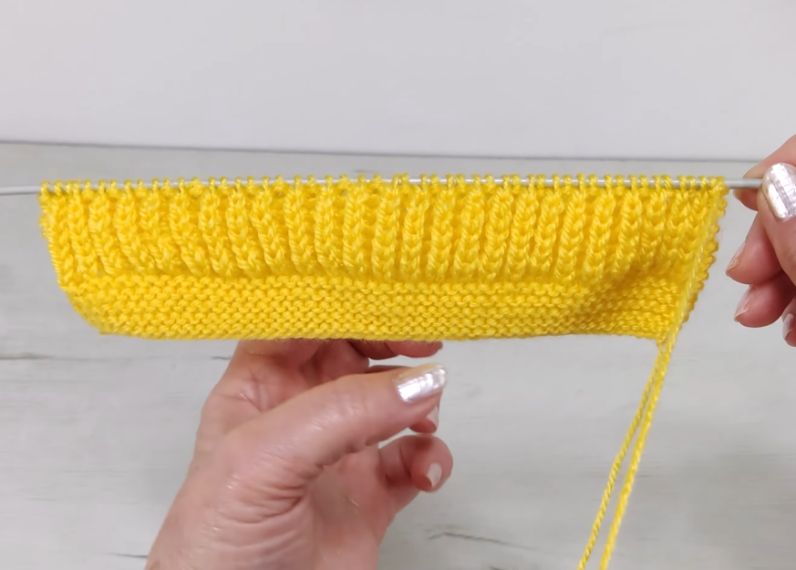 Row 15 (RS)K1, M1 (make 1), work in 1×1 Rib to the last st, M1, K1.34 sts
