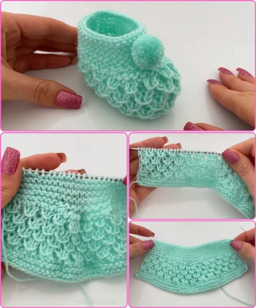 Repeat all steps for the second bootie. Enjoy the beautiful structure and texture of your finished Enchanted Scale Stitch Booties!