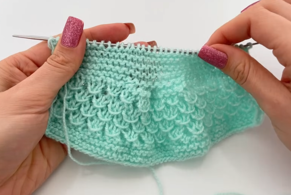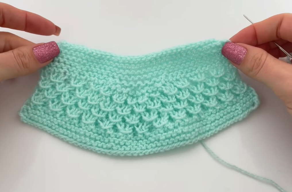 - Repeat the four-row Scale Stitch pattern (Rows 7-10) until the entire panel measures approximately 6 cm (2.4 inches) in height. You should finish after a WS row (an equivalent of Row 8 or Row 10).