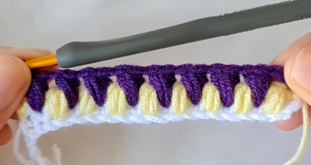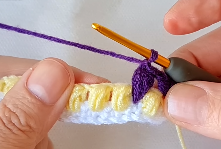 - Attach Color C (Purple): Insert the hook into the working loop (from the unfinished RP of Row 3). Yo with Color C, pull through the loop. Ch 1 with Color C.