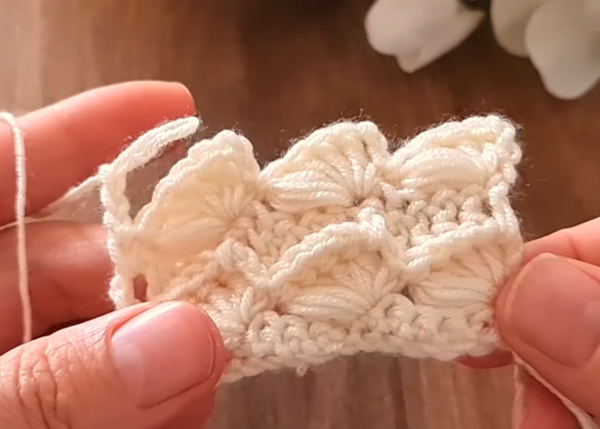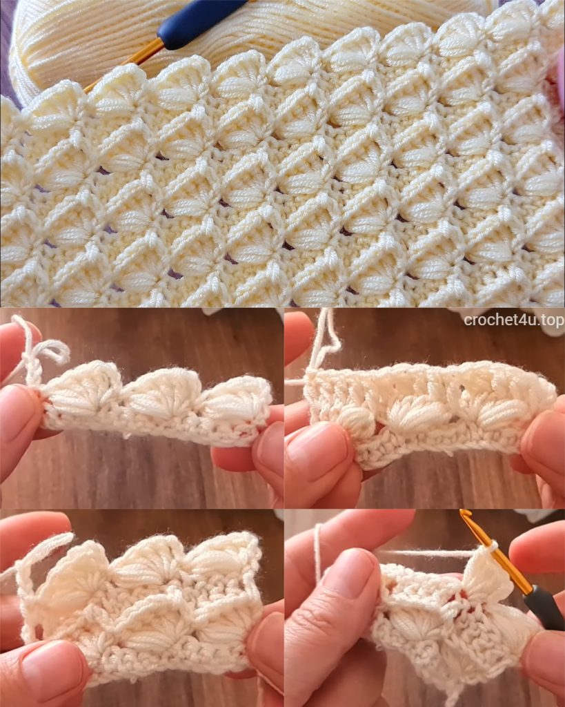 • Yarn: A smooth, light-colored Worsted Weight (Aran/10-ply) yarn is ideal (like the cream/pale yellow shown). Smooth yarn helps the shell clusters pop, and the light color highlights the stitch definition. This stitch also looks stunning in DK weight for a lighter feel.