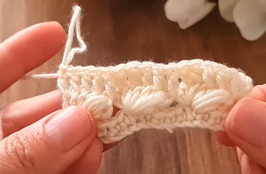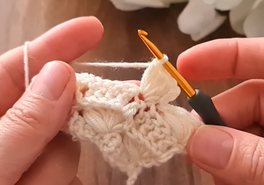 This row uses basic shells and single crochet stitches to set the spacing for the clusters.