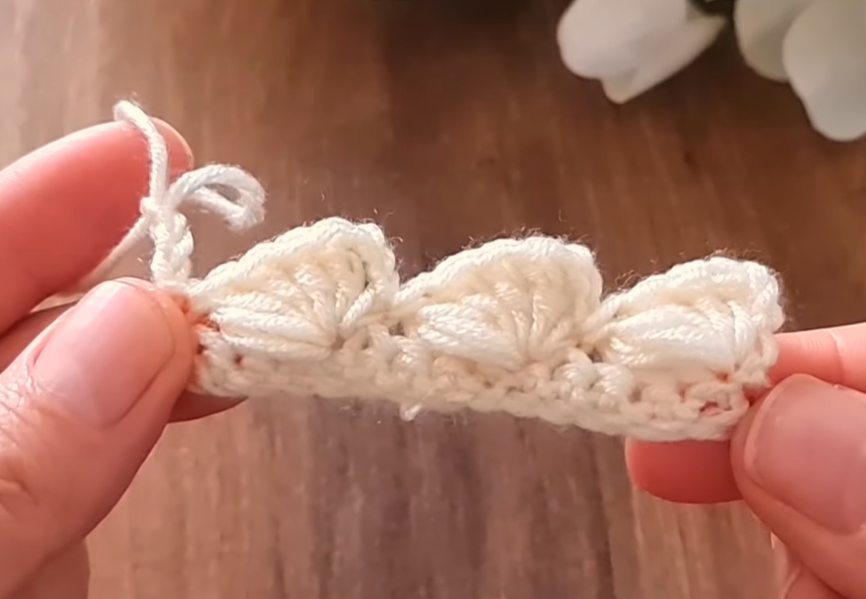 3. Work a SC (3 dc, ch 1, 3 dc) into the ch-1 space of the next shell from Row 2.