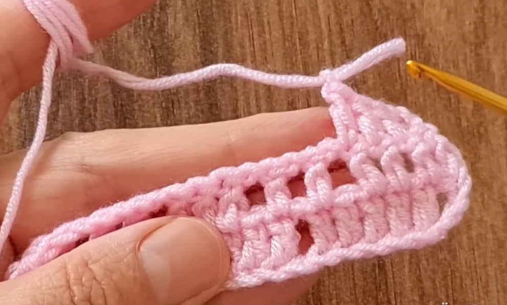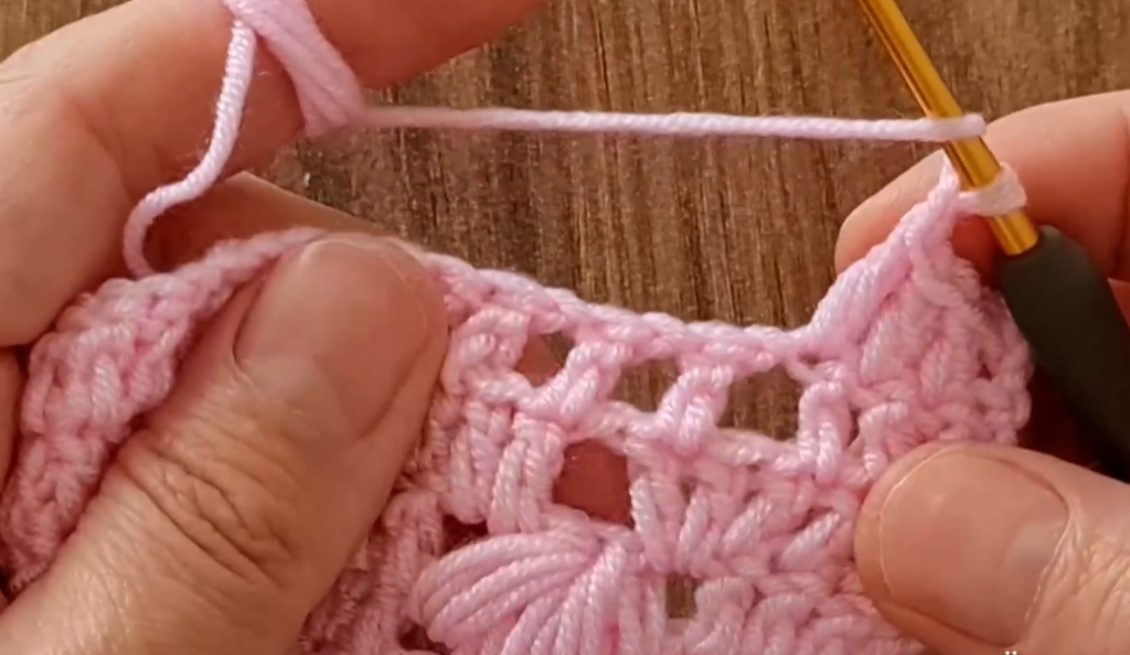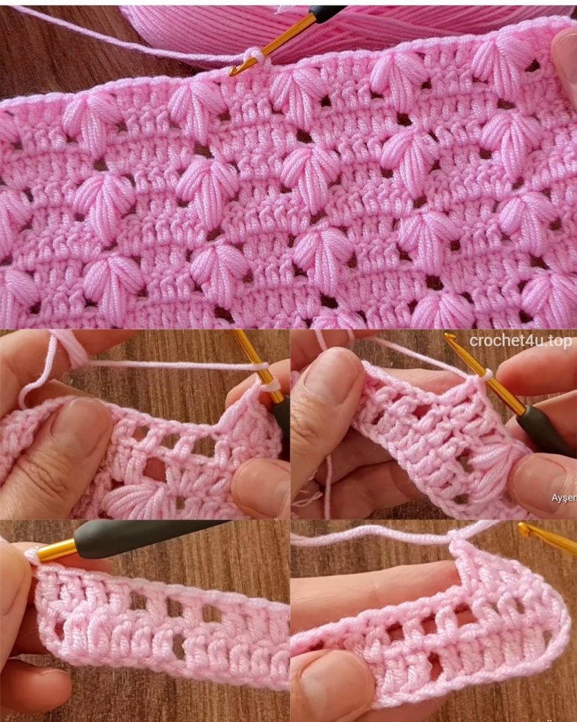 The key to this pattern is the precise placement of the long puff stitch into the row two below. Let’s master this lovely pink texture!