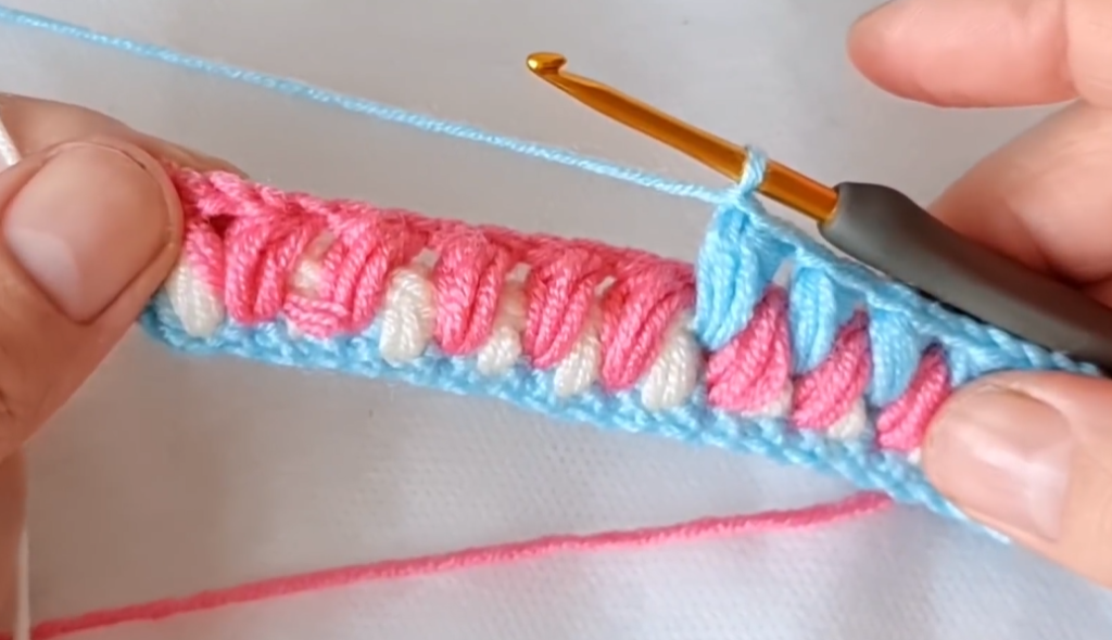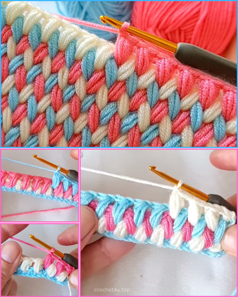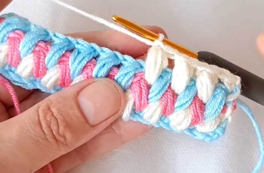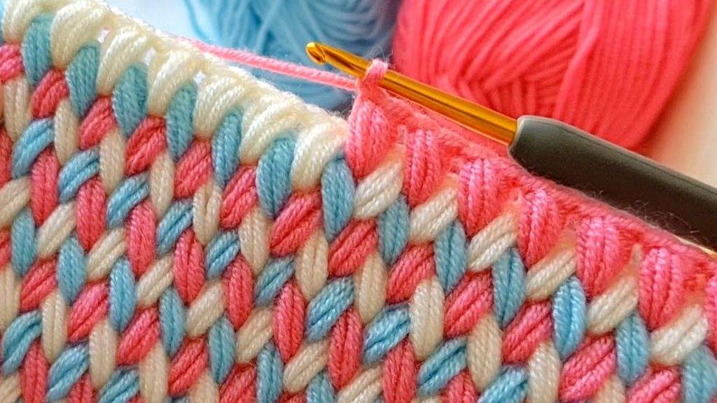 Welcome, adventurous color workers! The stitch in this photo is a showstopper, combining three colors (pink, white, and blue) into a dense, interlocking vertical weave. This fabric is incredibly warm, sturdy, and has a fascinating texture that looks beautiful from both sides. It’s perfect for reversible scarves, stable bags, and cozy throws.