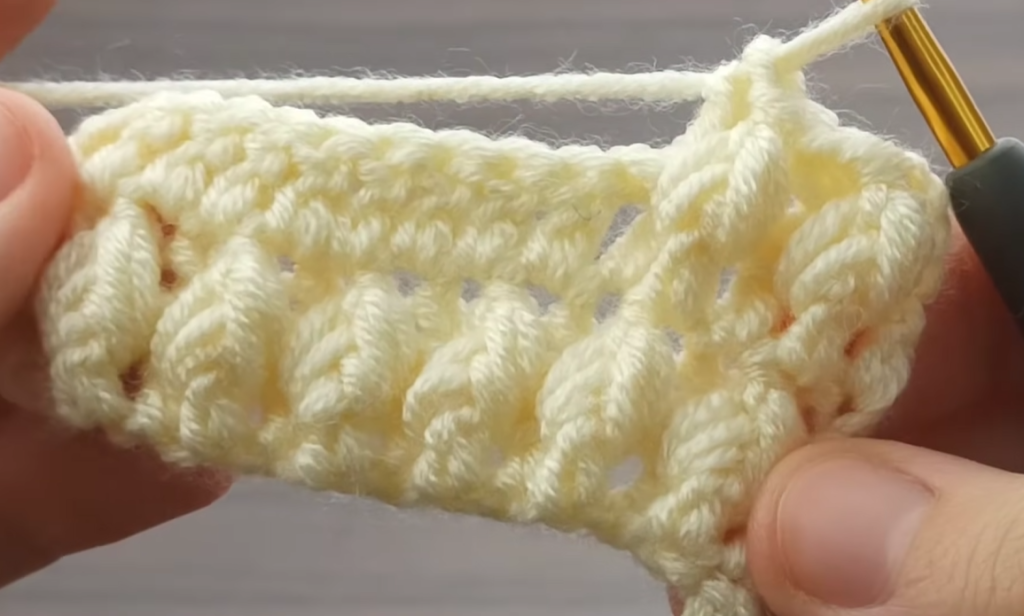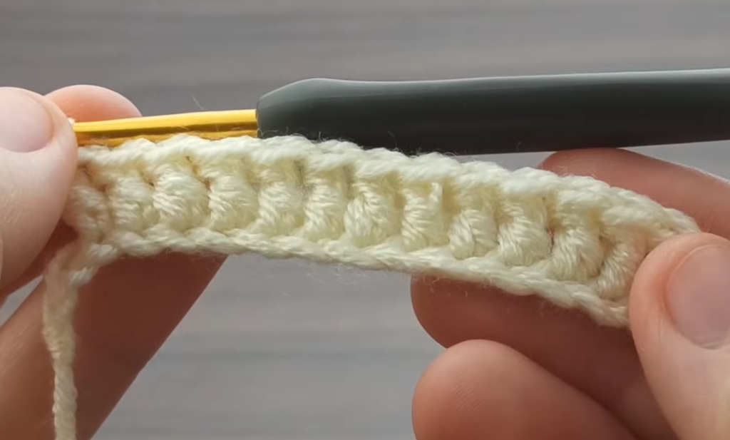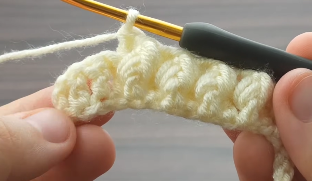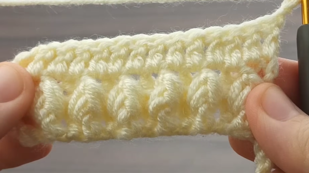 This is a modified cluster stitch (similar to a puff stitch) worked specifically into the back loop to create the raised, vertical texture. We will use 3 pulls for a good, plump bobble bar.