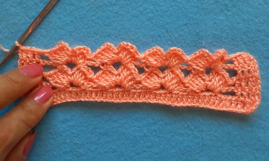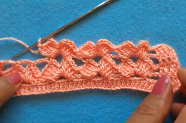 This row creates new chain loops, positioning them over the center of the previous shells, which shifts the placement for the next motif row.