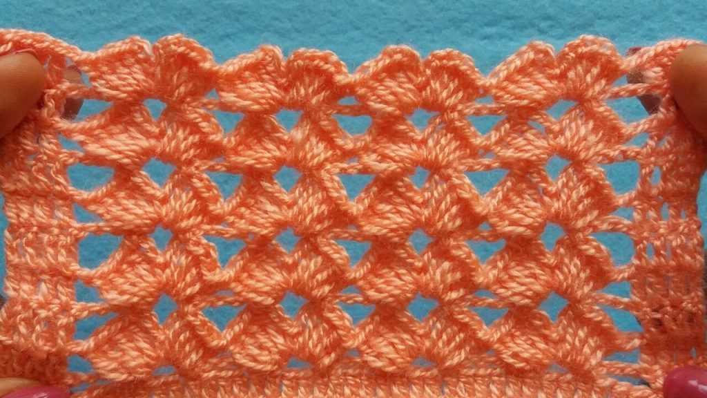 - Repeat: [Ch 3. Sk 4 sts. Sc in the 5th st.] Repeat the sequence across the row until you reach the last 5 stitches.([03:08] – [04:11])